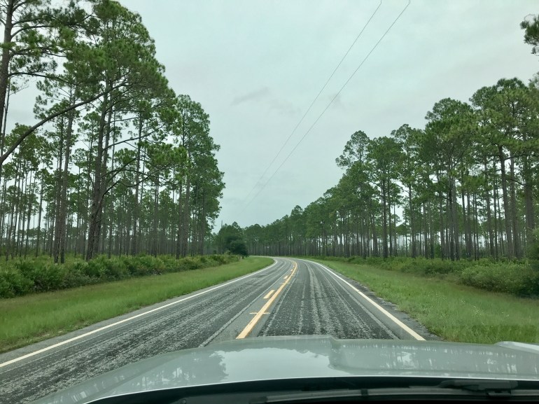 Nineteen miles of Florida scrub, a single-lane 45-mph pockmarked road offering one slowly passing truck, and I finally pull into a BP gas station straight out of 1986. Yes, they have free WiFi, and yes, there’s a table I can sit at in the “Cafe.” I sit, my table adjacent to a salty old gentleman flirting robustly with a gas station employee, chattering and tittering at their inside jokes. I buy some water and Chex Mix, finish my work, and gas up my tank. Drive back to the campground—with a quick detour to sit on the side of the road to check my iPhone Emails before the Verizon signal melts away from four bars to zero with each passing mile, and stare around me at a depressing expanse of felled pine trees and full logging trucks. Welcome to nature: see it get raped by man before your very eyes.