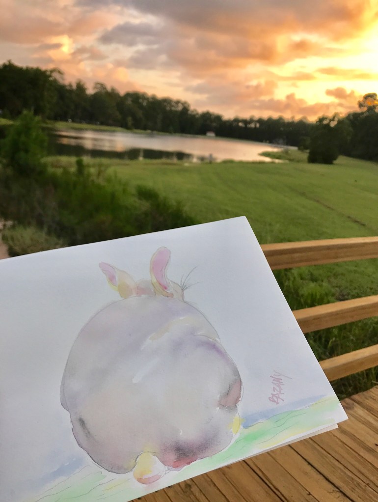I say hello, sing her the bun-bun song, and return to my paints. I have just painted three more watercolors — bunnies, of course — and am winding down this Sunday by relaxing in a way I haven’t enjoyed in many weeks. Months, maybe. Reading, painting, sitting. No television, no grocery store rush trips to stock up for the week. I am simply here. Doing nothing but Being.