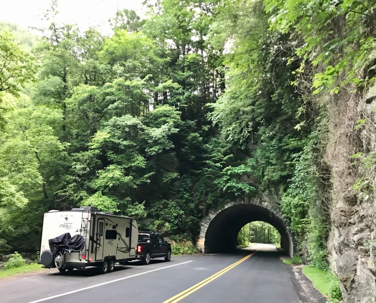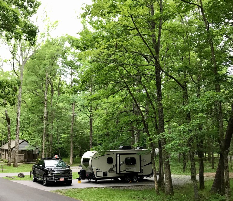 So now I sit in my gorgeous spot at Cades Cove, smack-dab in the Great Smoky Mountains National Park (Happy 86th birthday, GSMNP!), site C20, just on the cusp of the wild woods in the generator-free loop, close enough to the bathrooms to cringe every time I hear a toilet flush, but eLAted that I made it here in one piece, Junebug nestled comfortably on her cement pad, a fire roaring in the pit, and soaking up the 64-degree overcast day in these glorious mountains while crows, finches, and vireos sing around me and my belly grumbles for dinner. The grill is set up, the Blackstone Cabernet is warming my tummy from the inside out, and as always, as ever, I am grateful to be here in the woods smelling the delicious aroma of burning firewood.
